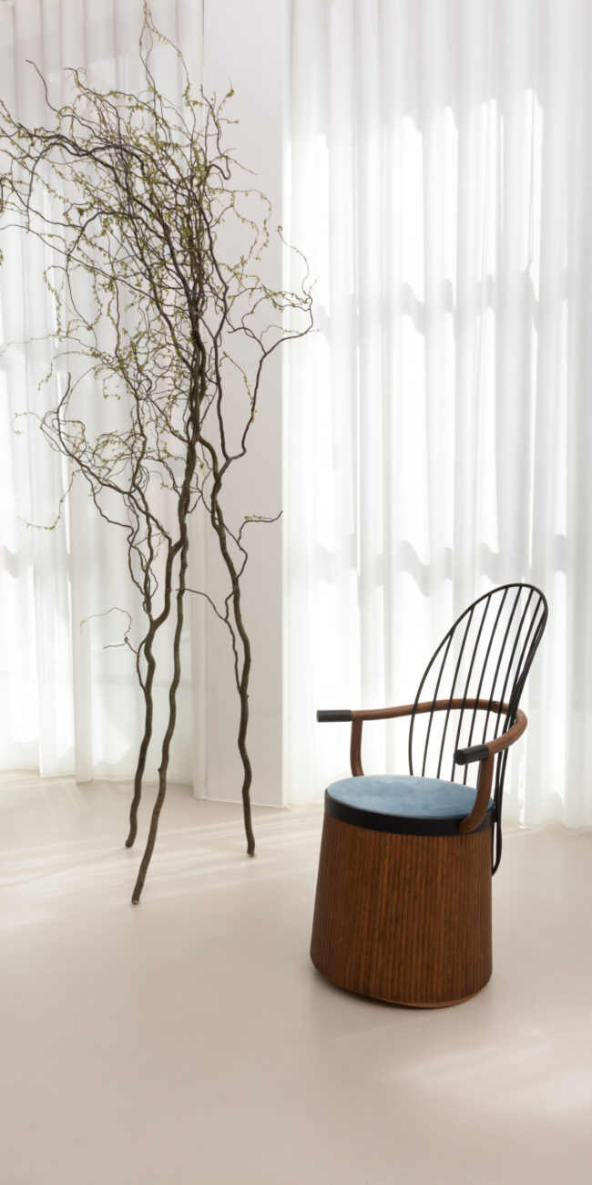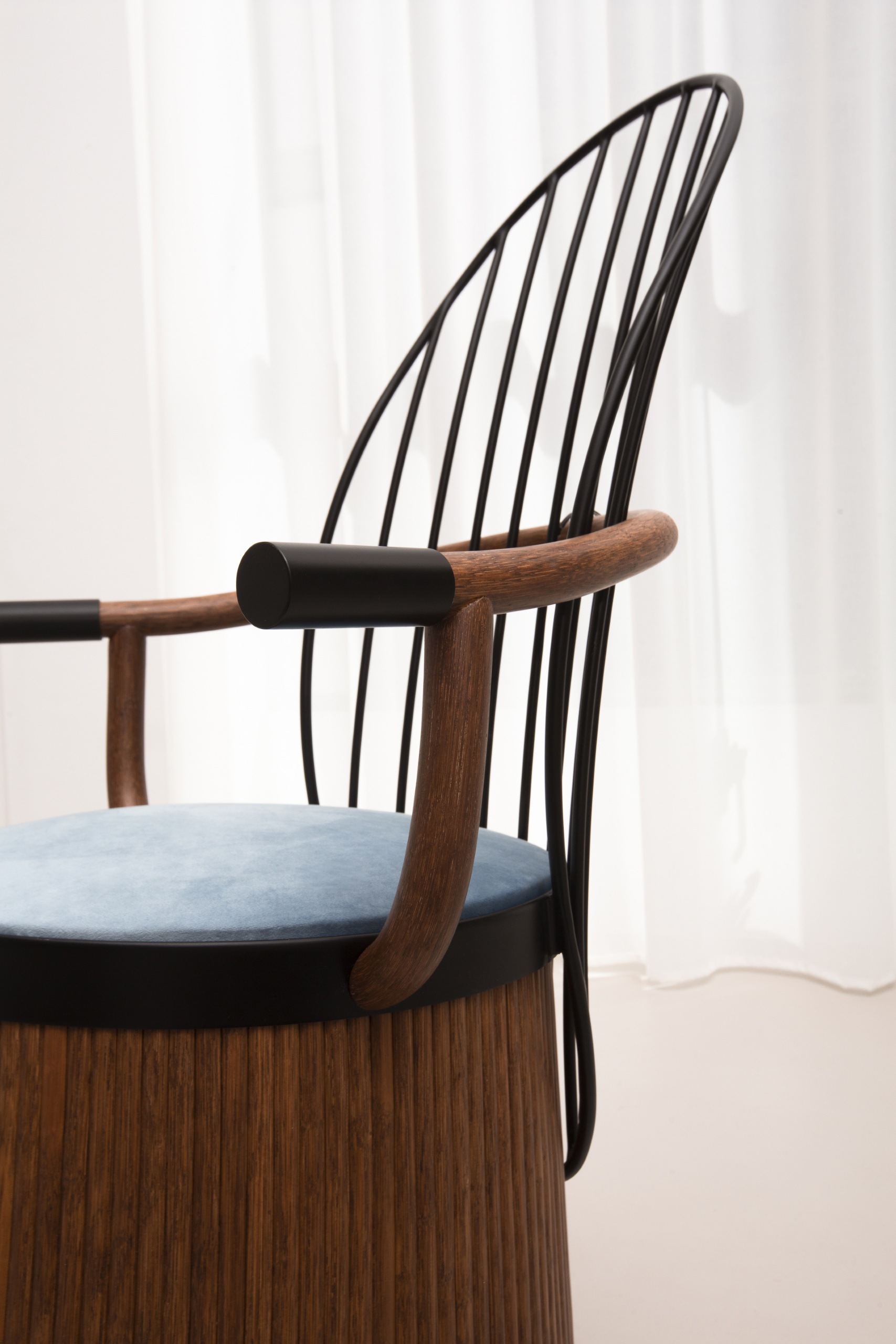 La base della seduta è troncoconica ed è realizzata con bacchette di rattan tagliate a mano dall’artigiano e assemblate una per una, il bracciolo è realizzato in canna piegata e lo schienale in ferro verniciato.